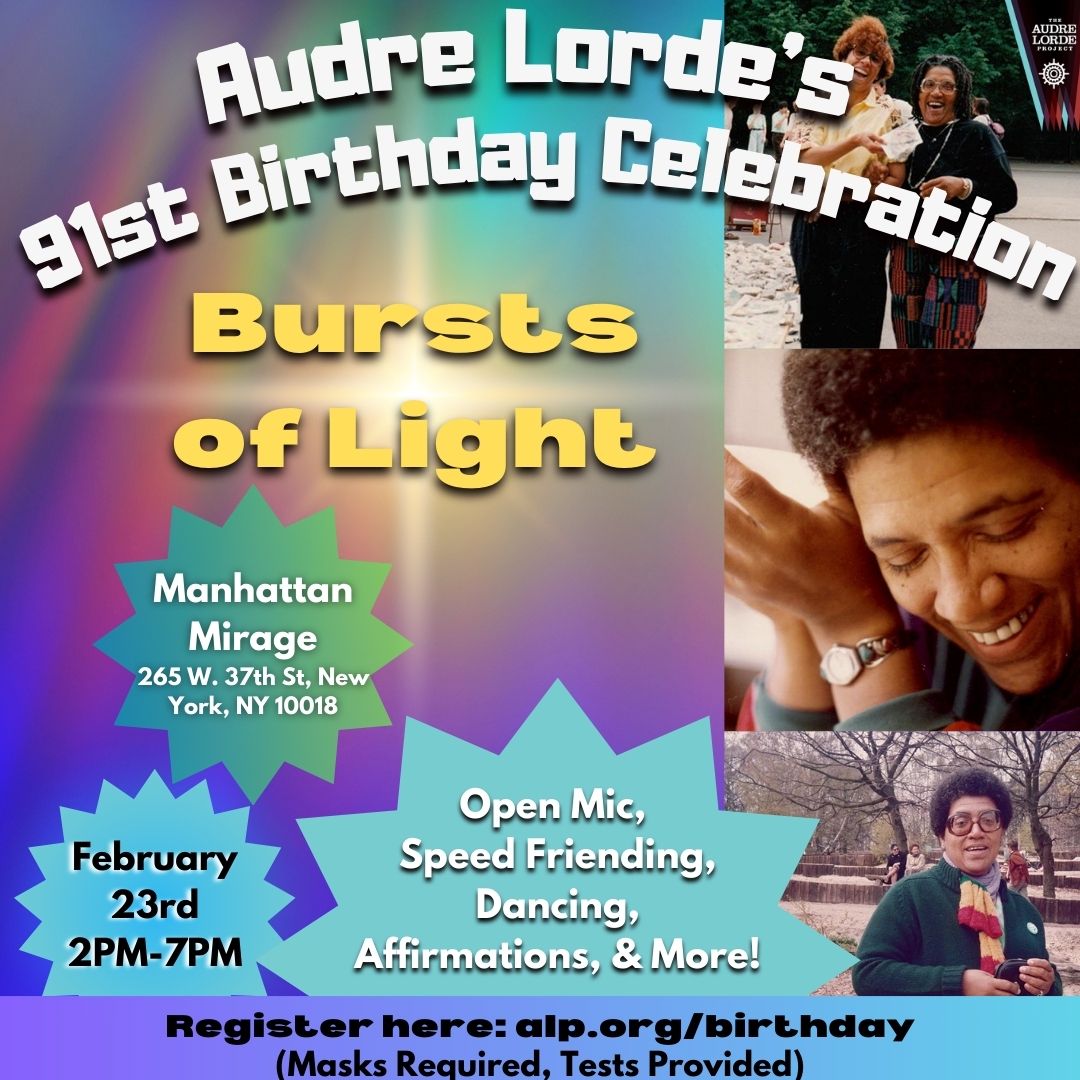 This event is a space for joy, healing and community, bringing together QTBIPOC to celebrate in the spirit of Audre Lorde's work. Event highlights include a QTBIPOC open mic, and speed friending, where you will have the chance to discuss all things safety and liberation – and maybe find a revolutionary bae in the process. Healers will be offering individual sessions of their healing practices, including reiki, acupuncture, and massage. We will also have an altar for Audre that we encourage folks to bring offerings for. We can't wait for you to join us for a night of joy and memory!