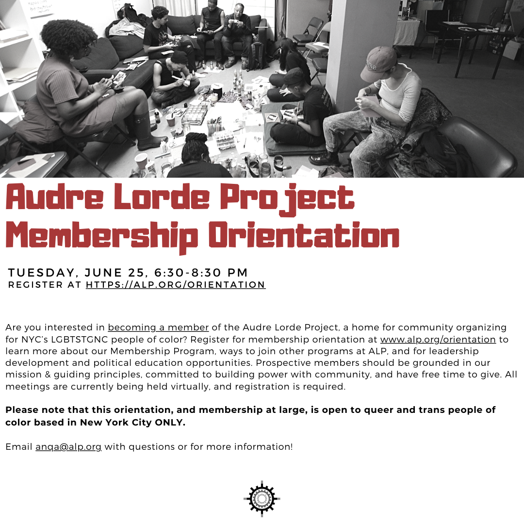 Energized by Pride and want to organize for queer liberation year round? Come learn more about joining membership at the Audre Lorde Project, a home for community organizing with NYC’s LGBTSTGNC people of color! Register for membership orientation at www.alp.org/orientation to learn more about the organizing work we do at ALP around housing, policing, healing justice, and so much more. From leadership development to political education opportunities to community building, we welcome folks to come through and co-create a vision for liberation for all. Prospective members should be grounded in our mission & guiding principles, committed to building power with community, and have free time to give. All meetings are currently being held virtually, and registration is required.