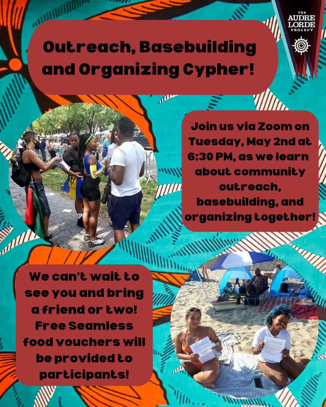 Join us for our "Outreach, Basebuilding and Organizing" cypher on Tuesday, May 2nd at 6:30pm via Zoom, as we discuss outreach, basebuilding and its importance in our organizing. We can't wait to dialogue with you and make sure to bring a friend or two!
